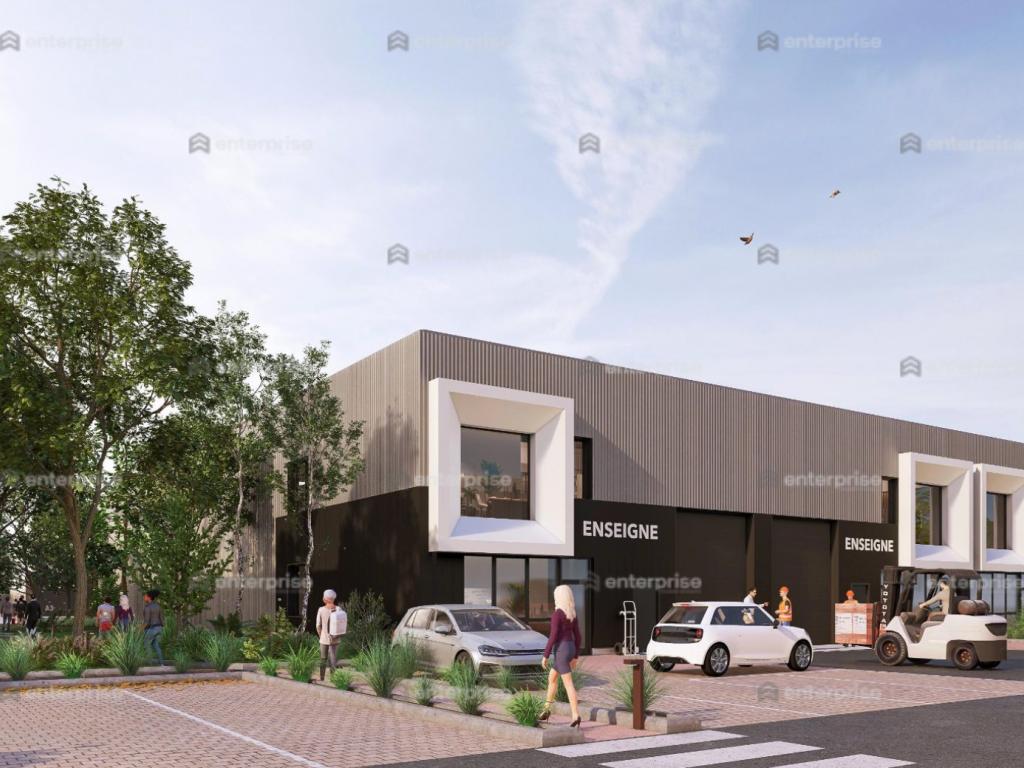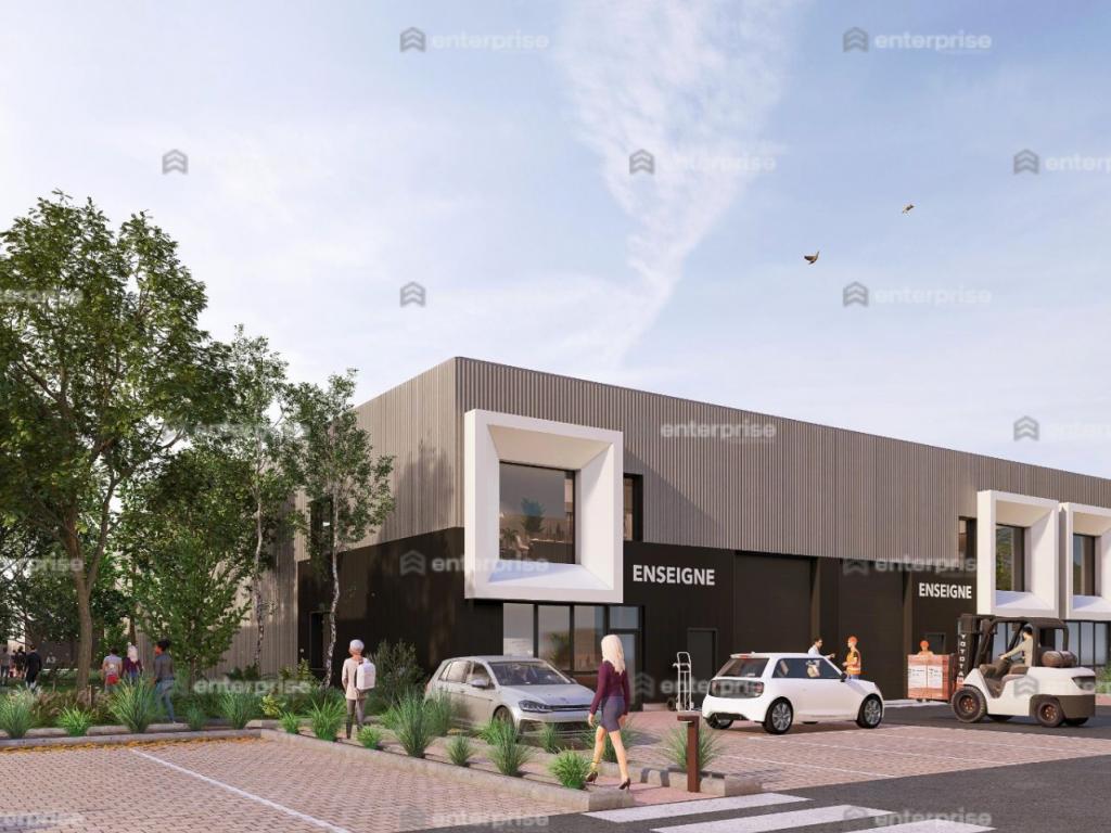Bardage Métallique de couleur clair en partie haute, de couleur anthracite en partie basse zone de bureaux marquées par caisson formant un encadrement blanc charpente métallique et murs extérieurs en béton pour les bureaux et en bardage métallique sur longrine béton pour les entrepôts 6,25m sous gousset 8m en extérieur support d'enseigne intégrés à l'architecture personnalisables bureaux chauffés par pompes à chaleur air/air double flux exutoires de toit manuels porte sectionnelle sur chaque cellule (hors bâtiment E)
