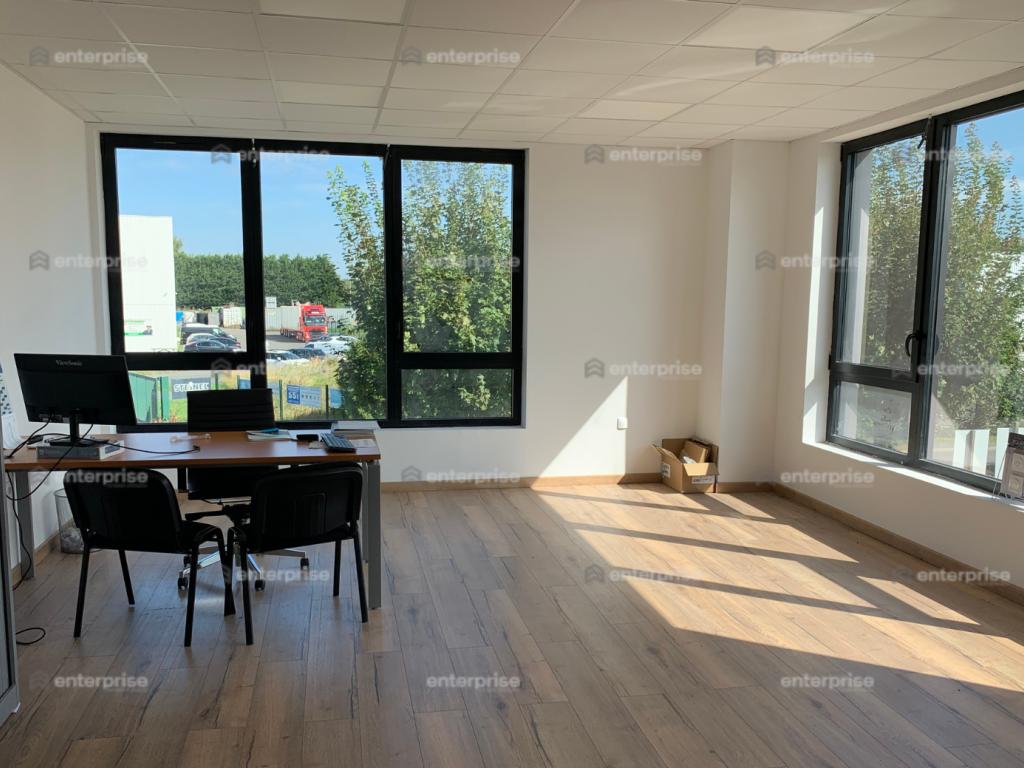 Accès véhicules légers et poids lourds Double accès Fibre optique Jardin paysager Bureaux cloisonnés Local technique, cuisine, faux-plafond, parquet et chauffage électrique Hauteur libre : 7 m Porte sectionnelle de plain-pied Tarif bleu Accueil Espace ouvert Parking Privatif