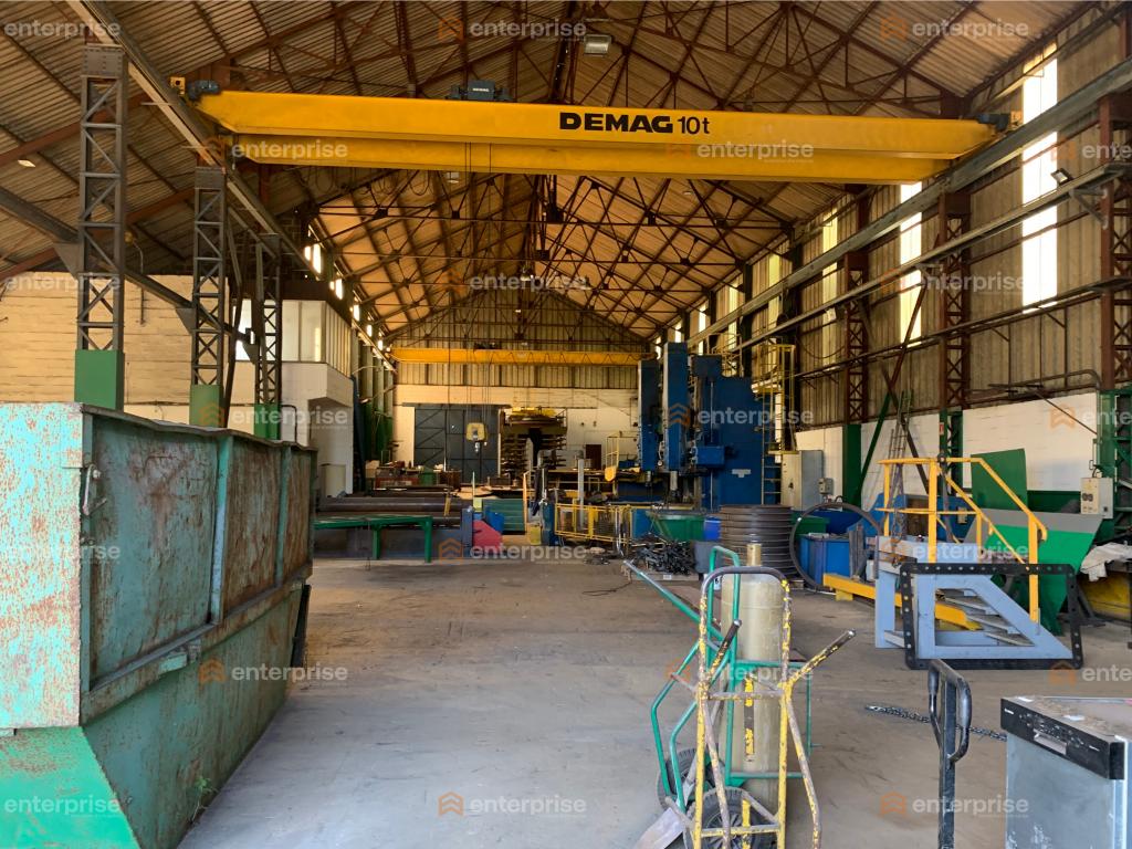 Pont roulant, voirie lourde, 7 portes de plein pieds, structure métallique, sol : goudron, hauteur : 10 m sous ferme au plus haut, 7,5 m au plus bas.