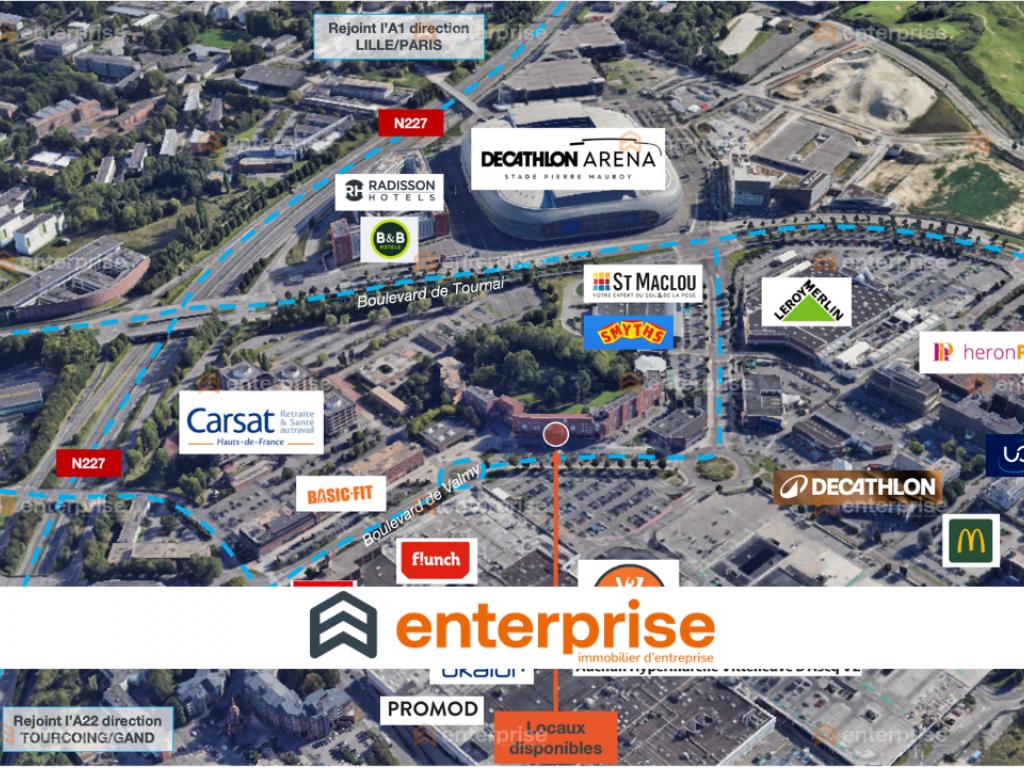 Sur la ville de Tourcoing, dans un parc d'entreprise se trouve un local commercial en copropriété de 316 m2 composé environ de 86 m2 en RDC et 230 m2 en R+1 est à Louer. Le Parking extérieur privé comporte 81 places. Vous retrouverez à proximité des enseignes tels que Comptoir des pros, Rexel, Destock Peintures,...